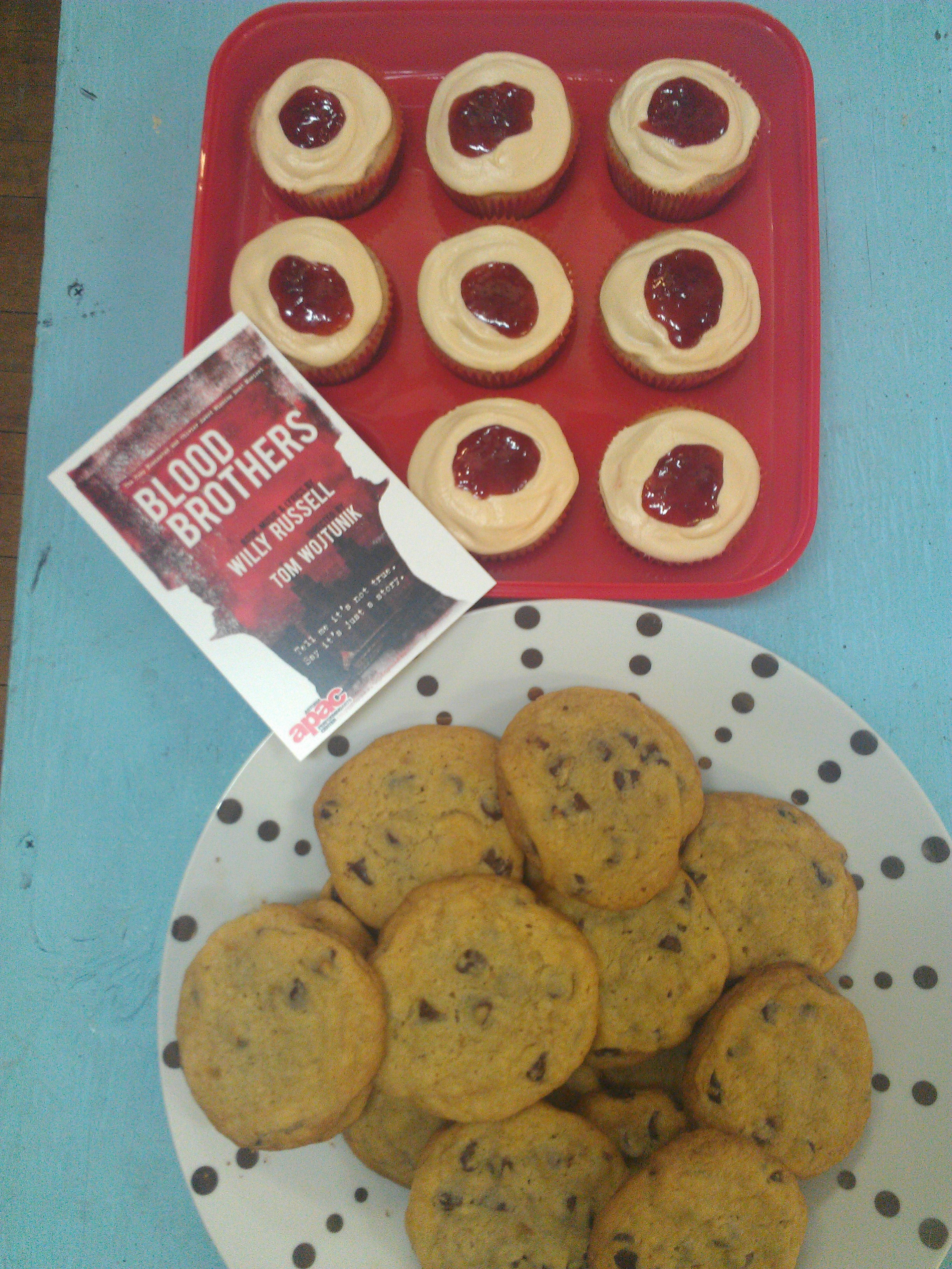 I swung by the APAC on Saturday to drop off the cookies and cupcakes before I had to jet into the city to teach lessons and didn’t want to stick around and bother the actors before the show. I completely forgot to take pictures, but luckily, my friend Jenny, wardrobe supervisor for the show, had the forethought to do it for me.
