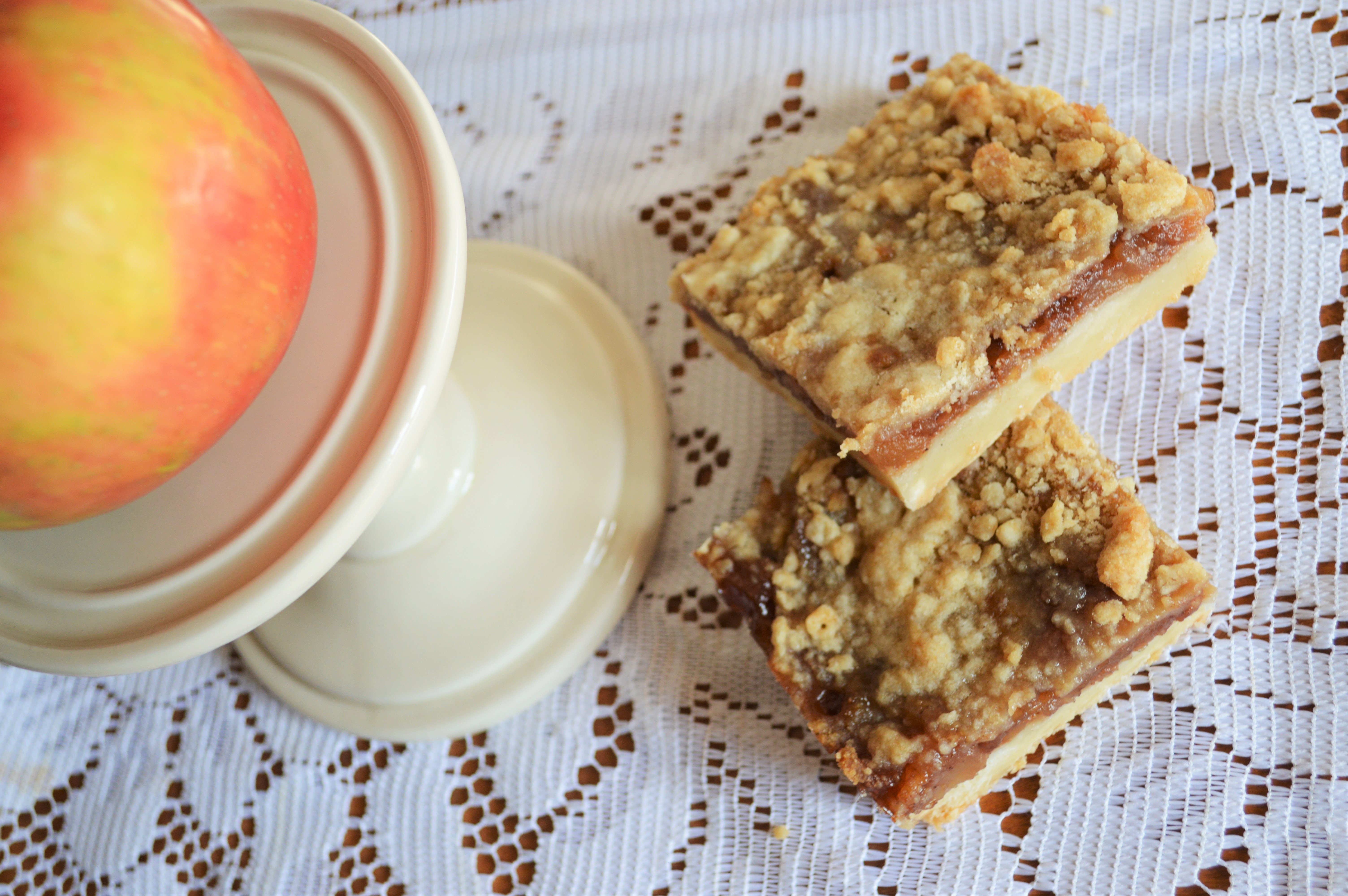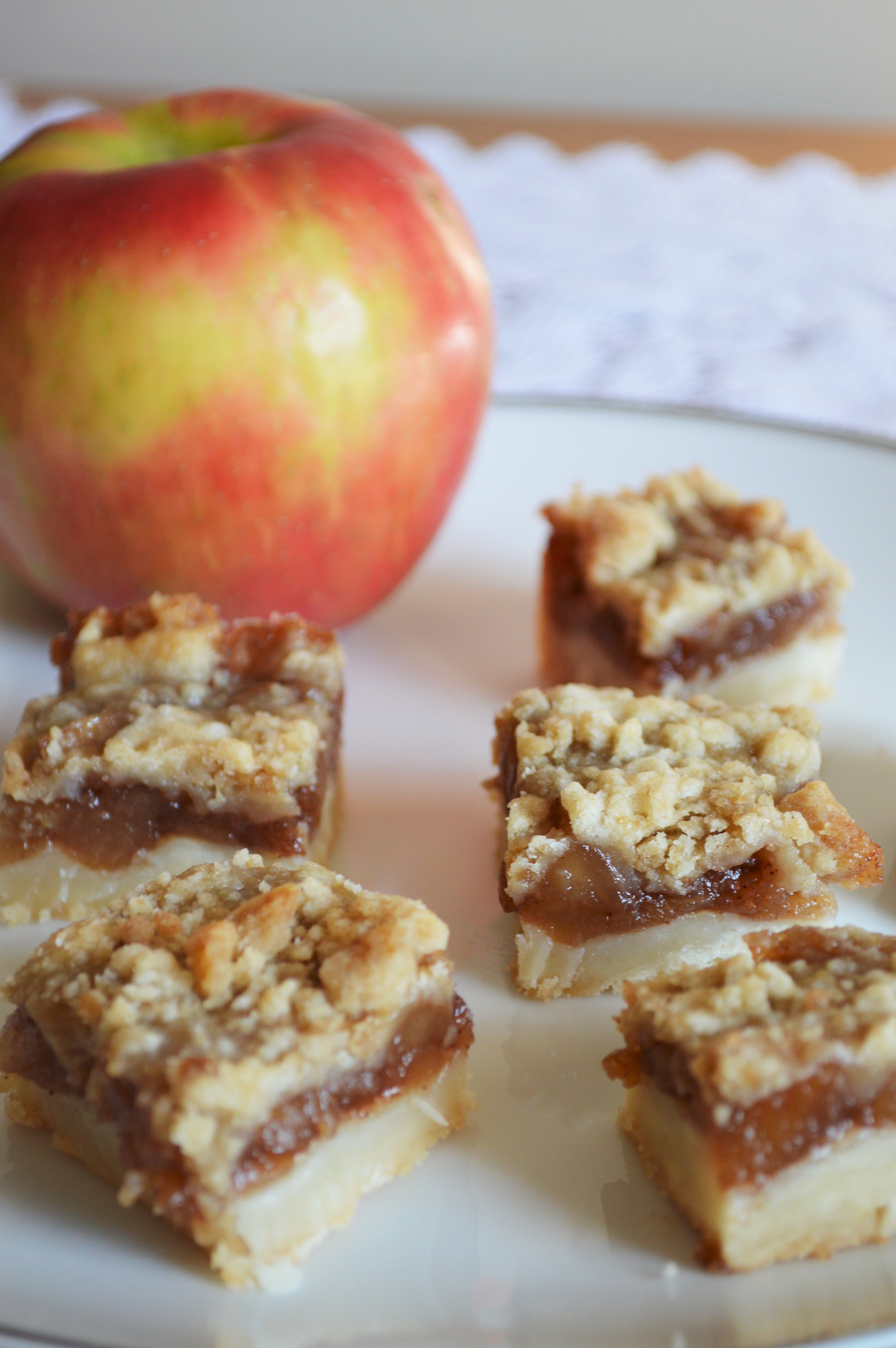 I developed this recipe as I was fiddling around with ice cream sandwich ideas for my featured dessert spot at The Queens Kickshaw. I tried a few ice cream pairings that I didn’t love until I put together one made from my almond sugar cookies and apple pie ice cream that I made by blending apple pie filling and vanilla ice cream together. My mother had made a similar apple pie dessert in non-pie form that day, which got me thinking about how to get an apple pie that you can hold in your hand that doesn’t come from McDonald’s or 7-11. The ice cream sandwich was killing it at being delicious, but I wanted to be able to pick up a piece of pie. The almond sugar cookie mixed well with the apple pie flavor, so I thought I’d go in that direction instead of a traditional pie crust. I settled on a shortbread bottom and crumb topping with all that cinnamony goodness in the middle and have never looked back!