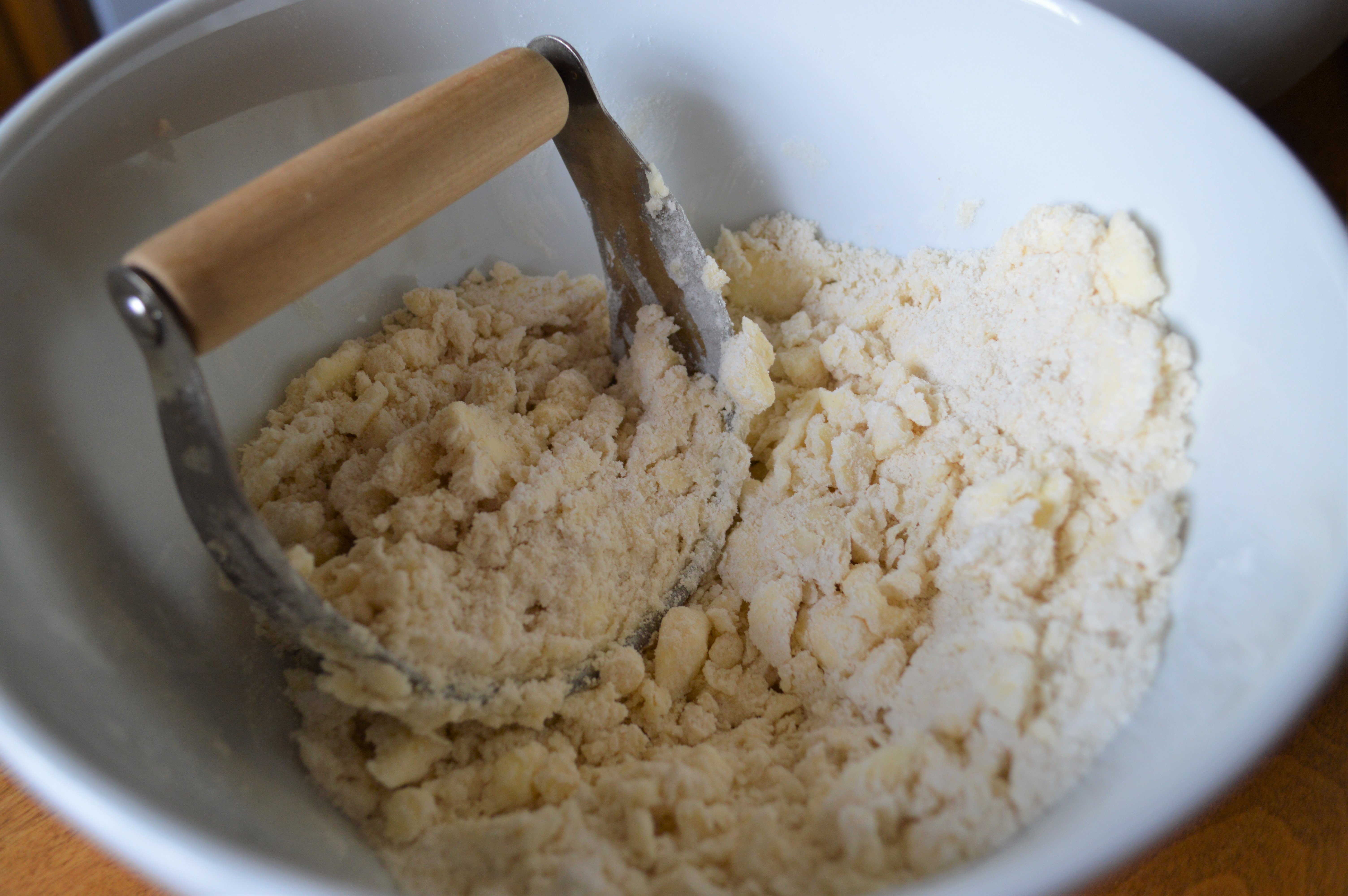 First preheat your oven to 350 degrees. Put all the ingredients for your shortbread crust in a medium sized bowl. Use your dough cutter to mix and blend the ingredients.
