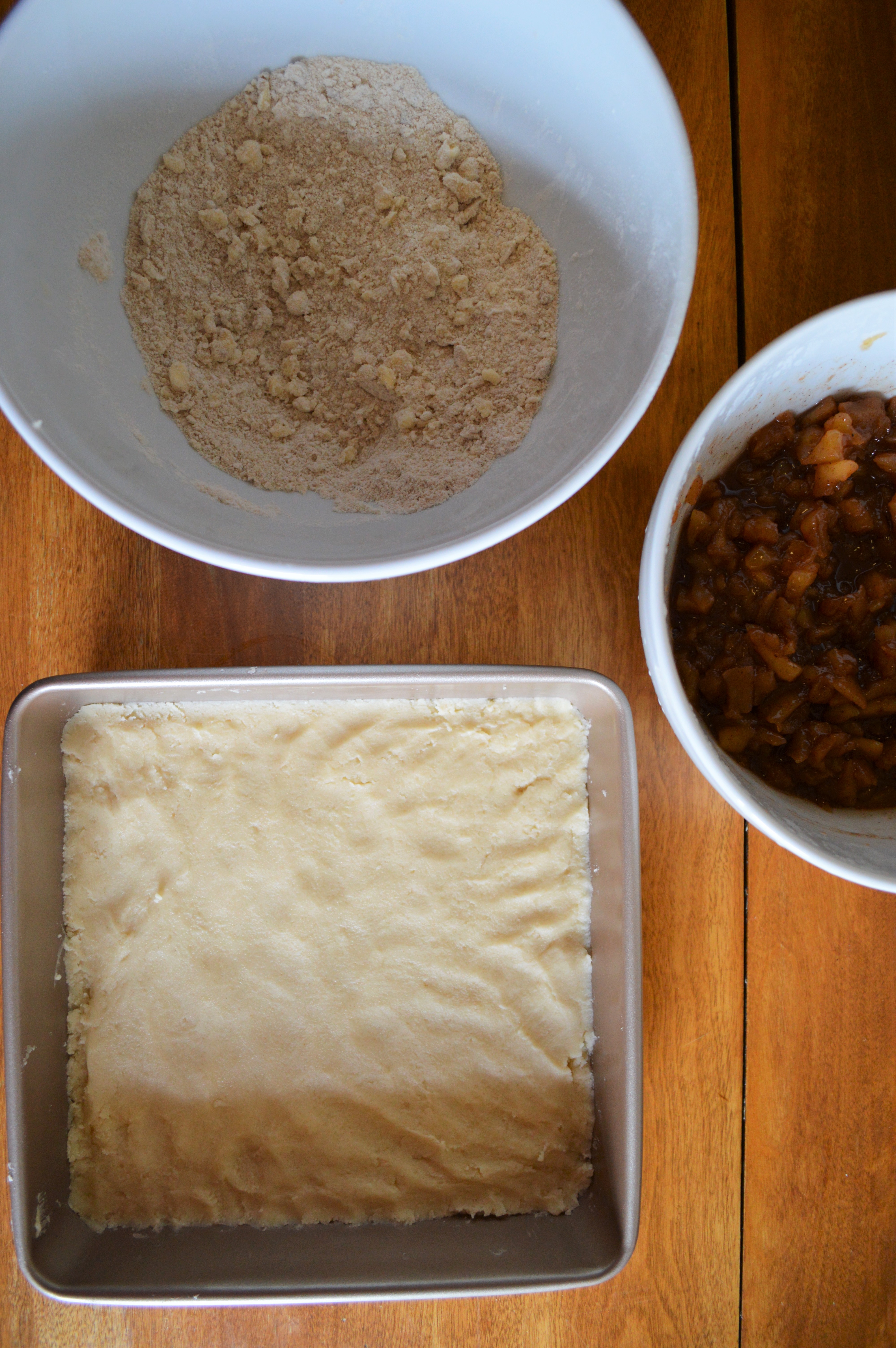 No need to grease; there is plenty of butter in the shortbread already. Take out your pre-made apple pie filling and pour that evenly over the shortbread.